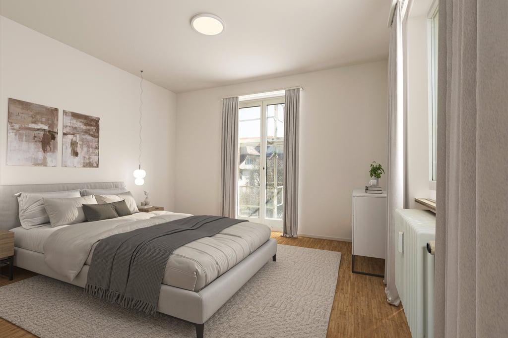 2 Schlaf- oder Arbeitsräume mit massivem Eichenparkett und grossem Balkon zur ruhigen Gartenseite